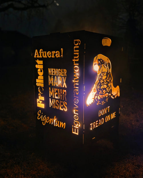Afuera – Feuertonne aus Cortenstahl | Plasmacut-Unikat mit magischem LichteffektUnverzichtbar im Garten oder auf der Terasse für alle Freunde der Freiheit!Afuera - diese Feuertonne aus hochwertigem Cortenstahl 3 mm ist mehr als nur eine Feuerstelle: Zeig Deinen Freunden die Liebe zur Freiheit. Das detaillierte Lasercut-Design leuchtet abends in warmem, golden-orangem Feuerlicht – ein echter Wow-Moment für Gartenpartys, Terrassenabende oder als persönliches Geschenk.